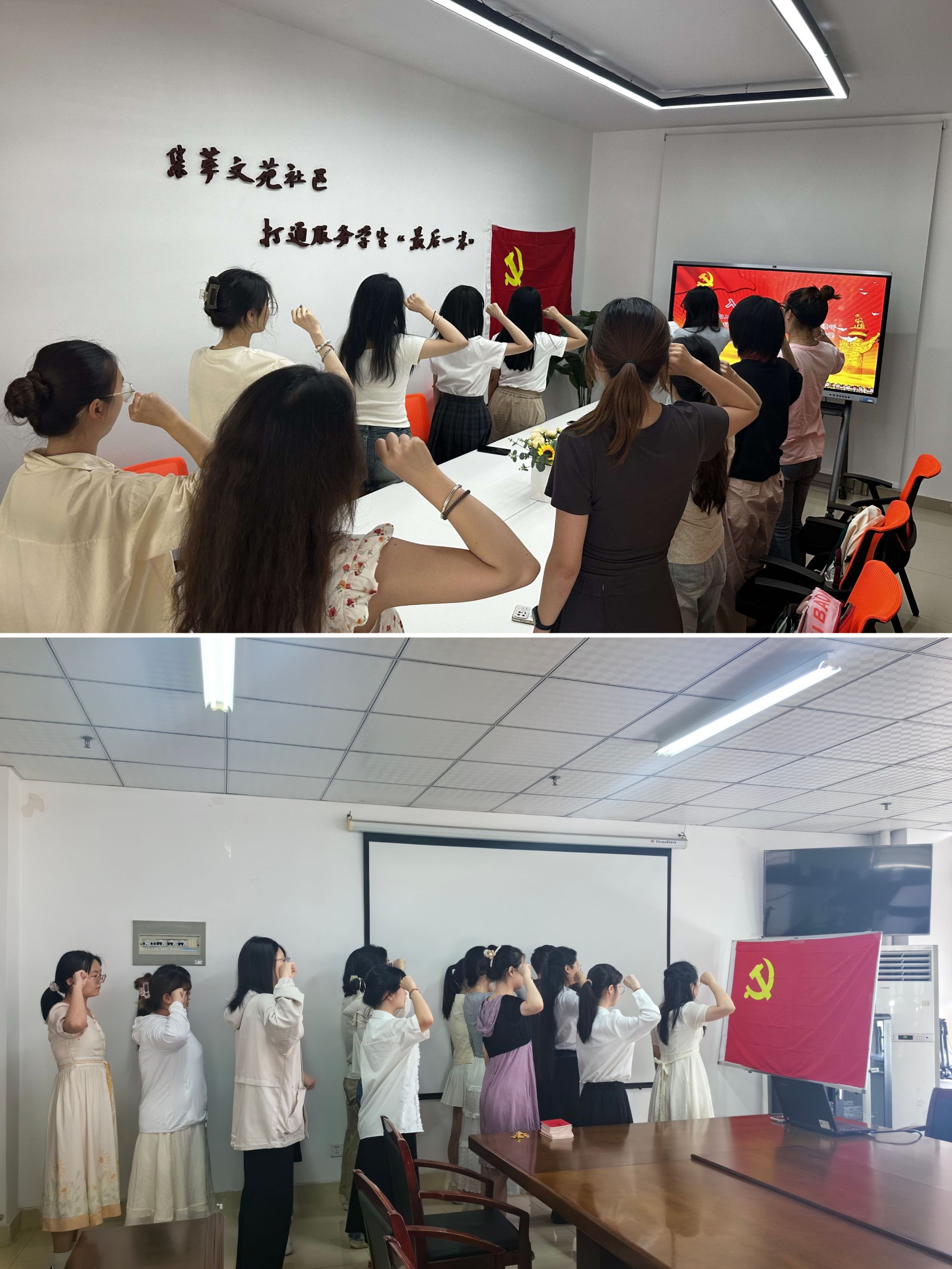 仪式在《国际歌》中拉开帷幕。随后,李娟、疏淑进宣读新发展党员名单,并带领全体党员面对鲜红的党旗,举右手握拳,庄严宣誓,表达对党的赤诚之心和为共产主义事业奋斗终身的拳拳初心。