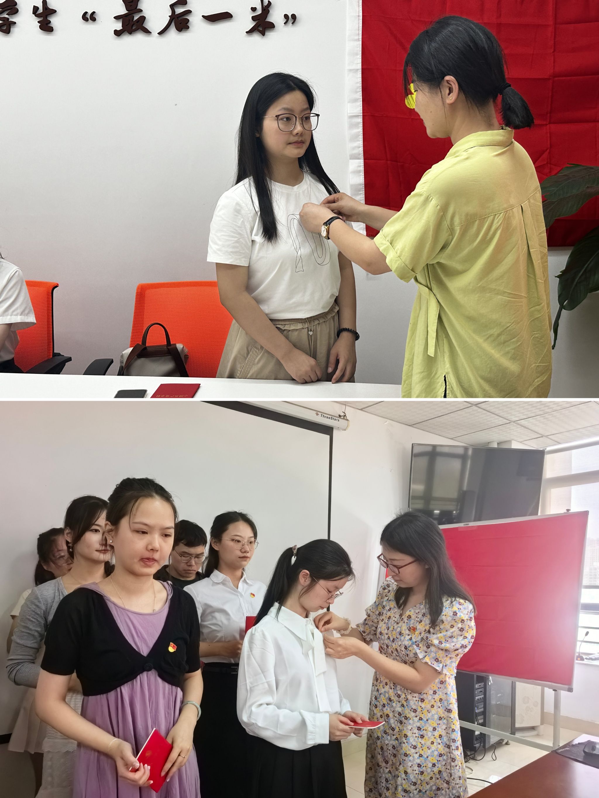 夏娟、曹甜甜分别给新党员送党章,戴党员徽章。
