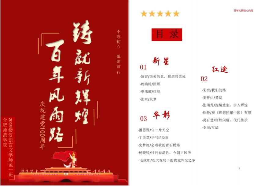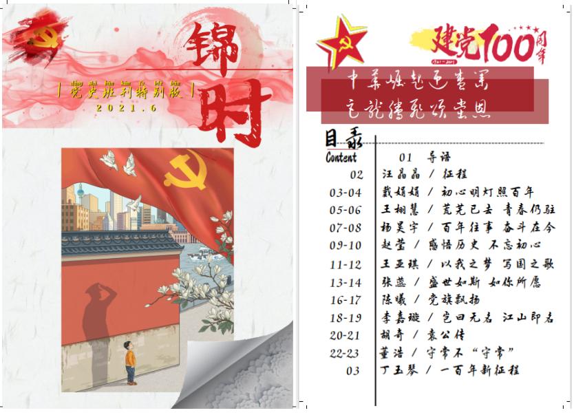 紧扣“用心学史、用情领悟、用笔记录、用力落实”的编纂初衷,beat365英国官方网站党委高度重视,2019级汉语言文学(师范)1班、2班班刊编委会在辅导员郝嘉乐老师的指导下,经过选题、组稿、审稿、编校、封面设计、出版等一系列环节,历时两月有余,完成党史学习教育专题班刊。自征稿以来,班级同学积极响应,成刊共收录作品27篇,内容包含党史学习教育感悟、树立理想信念、自强立志成才、革命书籍影片观感等丰富内容。