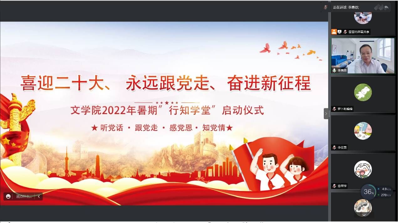 624日上午,beat365英国官方网站召开了以“喜迎二十大、永远跟党走、奋进新征程”为主题的2022年暑假行知学堂实践活动线上启动仪式。beat365英国官方网站党委书记李旺生、分团委负责人李惠恩、疏淑进以及全体小先生出席了启动仪式。启动仪式由李惠恩主持。