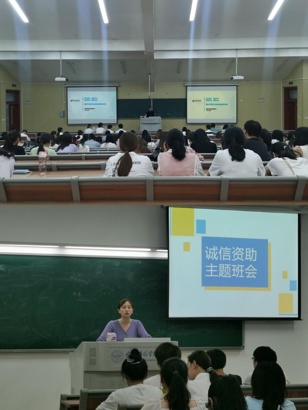 举办资助诚信教育主题班会。各年级辅导员通过召开主题班会,将助学贷款宣传片、宣传手册PPT播放给学生观看,让同学了解国家资助政策,以及党和政府的庄严承诺“不让一个学生因家庭经济困难而失学”。通过案例讲解,帮助大学生树立诚信意识,提高学生对诚信重要性的认识。同时,教育和引导同学们树立正确的受助感恩观念,培养同学们强烈的社会责任感和自立自强的优秀品质。同时,各班级辅导员利用本次主题班会号召大家在即将到来的期末考试中,端正考风,严肃考纪,诚信参加考试。