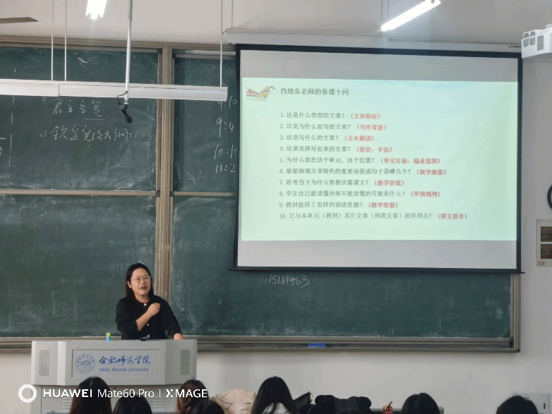 为贯彻师范认证的持续改进理念,推进汉语言文学专业课程建设,12月16日,beat365英国官方网站邀请安徽省教育科学研究院谢发茹老师走进“语文课程与教学论”课堂,为2024级汉语言文学专业师范生讲授“中学语文课堂教学提质路径探索”。