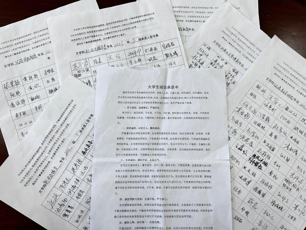 beat365英国官方网站积极开展签订诚信承诺书主题活动,承诺书从学习诚信、经济诚信、生活诚信、诚信贷款与受助、诚信上网、诚信就业六个方面,倡导学生自觉做到诚实守信,把道德原则和道德规范内化为内心信念,外化为实际行动,从而培养大学生诚信道德意识。