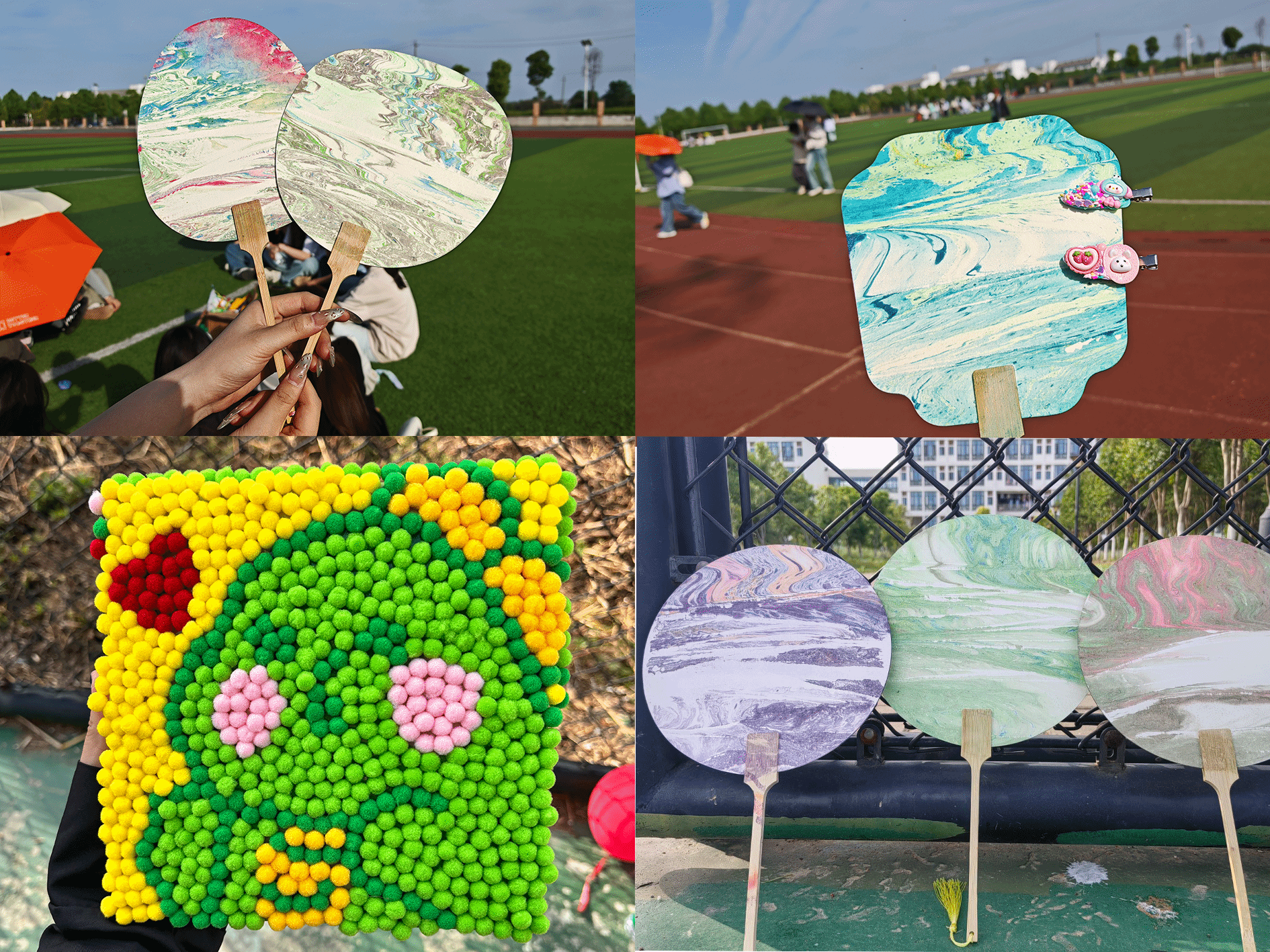 手工DIY活动区,非遗漆扇制作、国风手链、奶油胶发卡、毛球画diy等活动,共同为同学们提供了展现创意与传承文化的平台。非遗漆扇”的制作从空白到缤纷,每一步都充满惊喜,水中一转一漂,精美的图案便跃然纸上;奶油胶发卡diy制作环节,学生们神情专注,反复斟酌细节,沉浸式体验的创造乐趣;“毛球画DIY”活动打开学生们的想象力,缤纷、阳光、活力的“多巴胺”毛球让色彩灵感与独一无二的创意合二为一,开启了一段启迪美学的治愈之旅;“国风手链DIY”活动则聚焦新中式美学,晶莹剔透的珠子折射出五彩的光芒,学生们将各色的编织线左绕右转、挑线压线,让传统在指尖活起来,把春日玩“出圈”。文院学子在千年传统文化的体验中感受着生命的多彩与缤纷,体验着独属于他们的独家记忆。