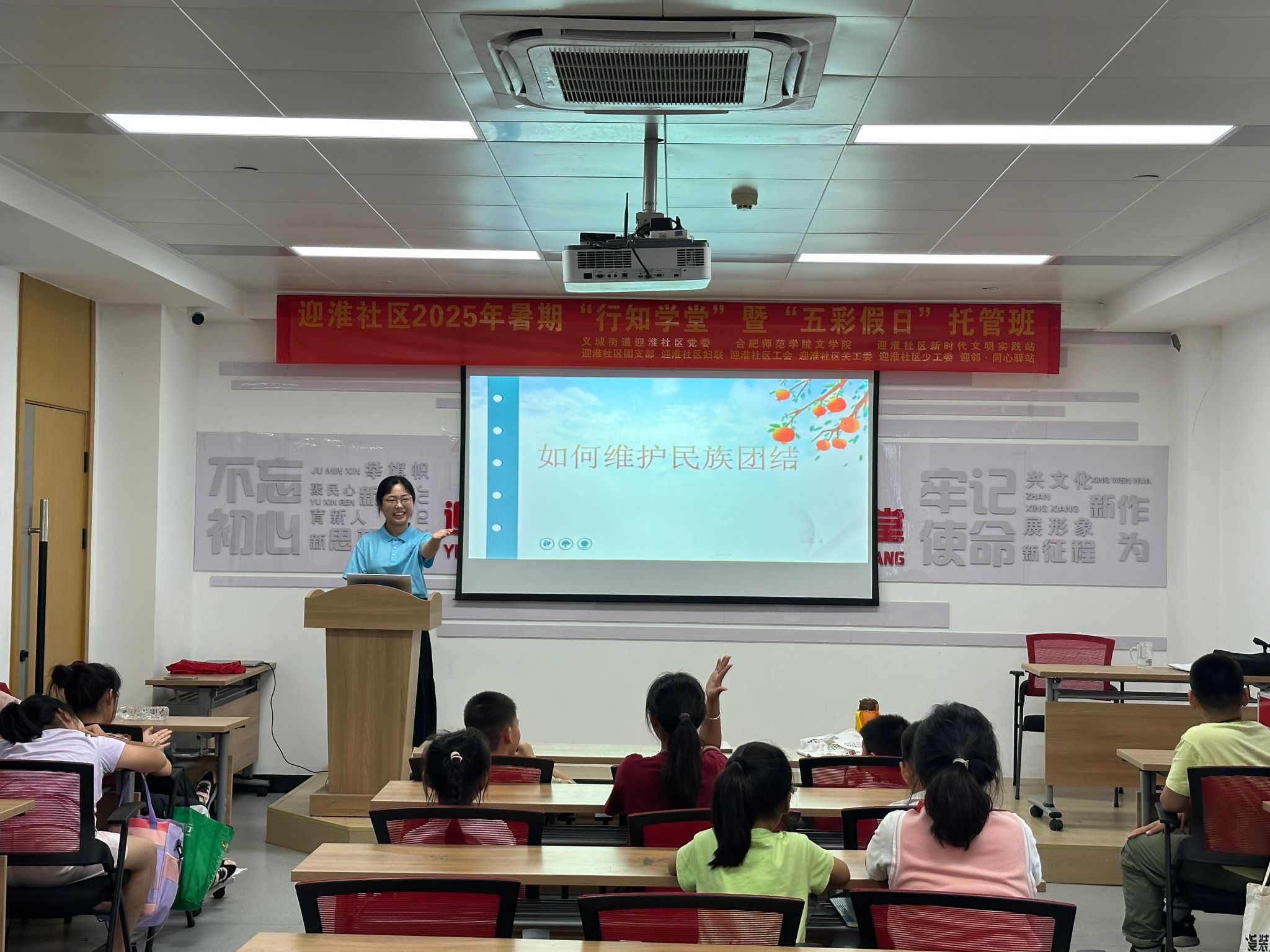 7月22日,迎淮社区行知学堂举办了一场以“石榴花开别样红 籽籽同心一家亲”为主题的民族团结活动,26名“小学员”参与其中。活动通过丰富多样的形式,促进了各民族间的交流与理解,弘扬了民族团结精神。