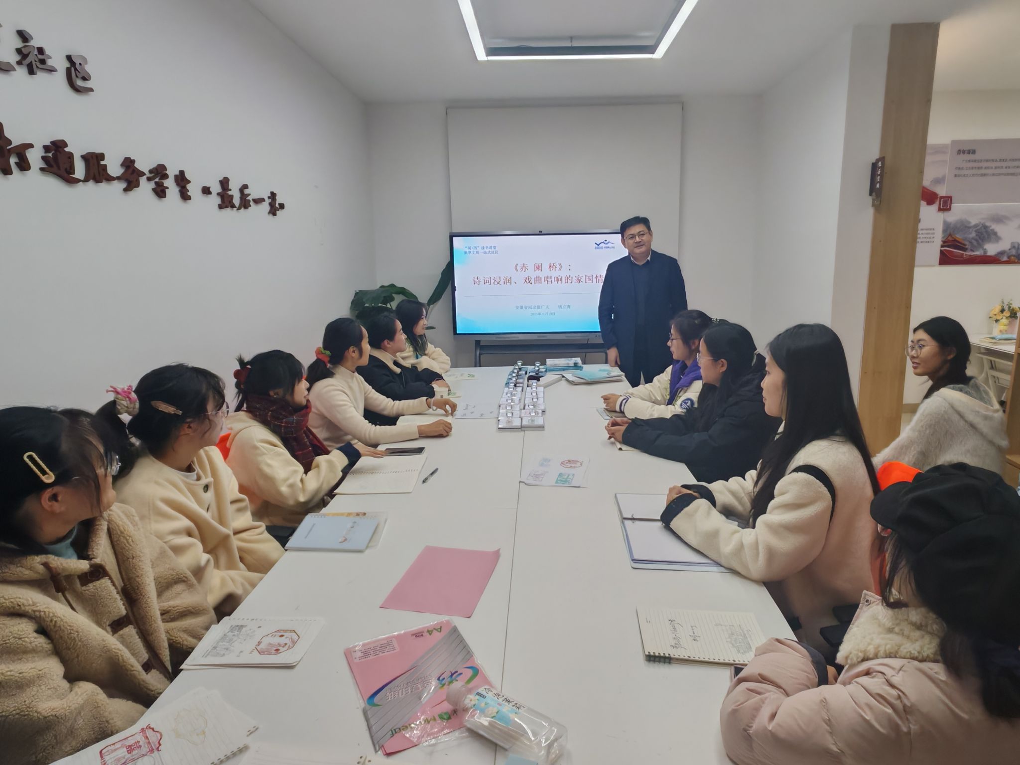 11月19日,“阅+历”读书讲堂走进beat365英国官方网站“集萃文苑”一站式社区“书香”活动月,江淮文化名家、安徽省十佳阅读推广人、教务处处长钱立青教授在集萃文苑以“《赤阑桥》:诗词浸润中的家国情怀”为题,为同学们呈现了一场融学术性、艺术性与体验性于一体的专题讲座。讲座以“赤阑桥”为叙事主线,通过集章、讲演、对谈等环节,层层展开一段跨越古今的文化旅程。