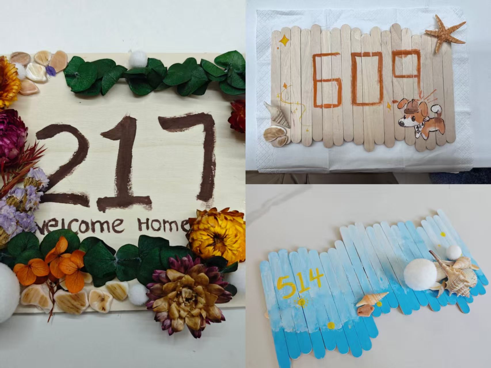 制作环节成为了创意与协作的展示舞台。同学们围坐在一起,热烈讨论设计构思:有的宿舍从所学专业中汲取灵感,将古典诗词意象或文学符号巧妙转化为门牌上的图案与文字;有的则融合了全宿舍成员的共同爱好,用色彩和图形讲述属于他们的独特故事;还有的注重实用与美观结合,设计出兼具留言板功能的创意装饰。一时间,切割卡纸的细微声响、调配丙烯颜料的低声交流、粘贴装饰物时的互相建议,交织成一曲温馨的手作协奏曲。