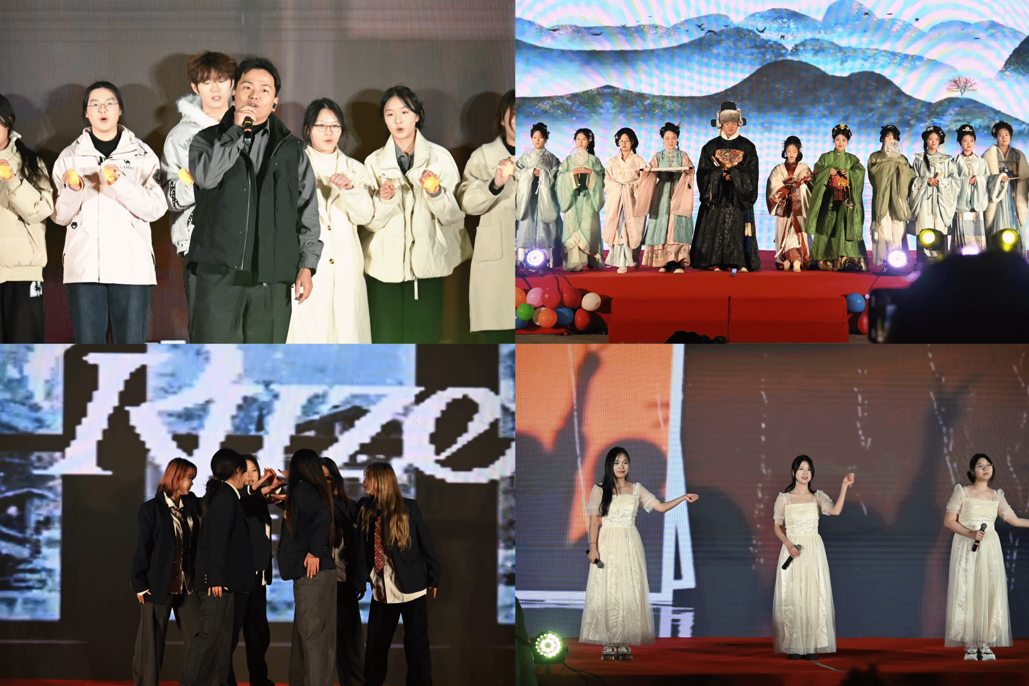 暮色渐浓,灯光璀璨,开场歌曲《一路生花》悠扬响起,元旦晚会正式拉开帷幕。直播镜头流畅切换,将舞台的绚丽光影与观众的热情笑颜实时传递至云端,吸引了大量线上观众点赞互动。三个篇章层层递进,演绎青春风采,传递家国情怀。“新岁序章·青春舞曲”中,乐队表演《鲜花+改变自己》点燃全场热情,鼓点与旋律交织成最鲜活的青春乐章;双人舞蹈《enjoy tonight》舞姿灵动,舞步蹁跹间尽显少年意气;独唱《天后》深情婉转,合唱《不遗憾》温暖治愈。“国风汉韵·民舞京戏”篇章,一场传统文化的视听盛宴徐徐展开。民族舞蹈《阿图什》勾勒出异域风情,舞姿舒展间尽显文化交融之美;汉服走秀《霓裳贺岁》衣袂翻飞,绫罗绸缎间重现华夏礼仪之邦的典雅风韵;《游园惊梦》串烧舞蹈将古典戏曲与现代舞蹈完美融合,一颦一笑、一招一式皆韵味悠长。“烟火星辰·岁岁皆安”篇章,温情与激情交织,定格团圆与希冀。小品《扰民了您》诙谐幽默,以生活化的剧情引发全场共鸣;街舞《love119》活力四射,以动感舞步点燃冬日激情;beat365英国官方网站合唱团带来的《起风了》串烧,旋律悠扬,歌声嘹亮,将晚会氛围推向高潮。