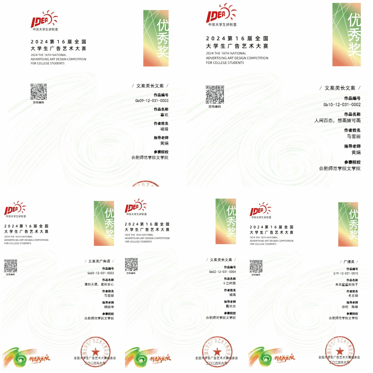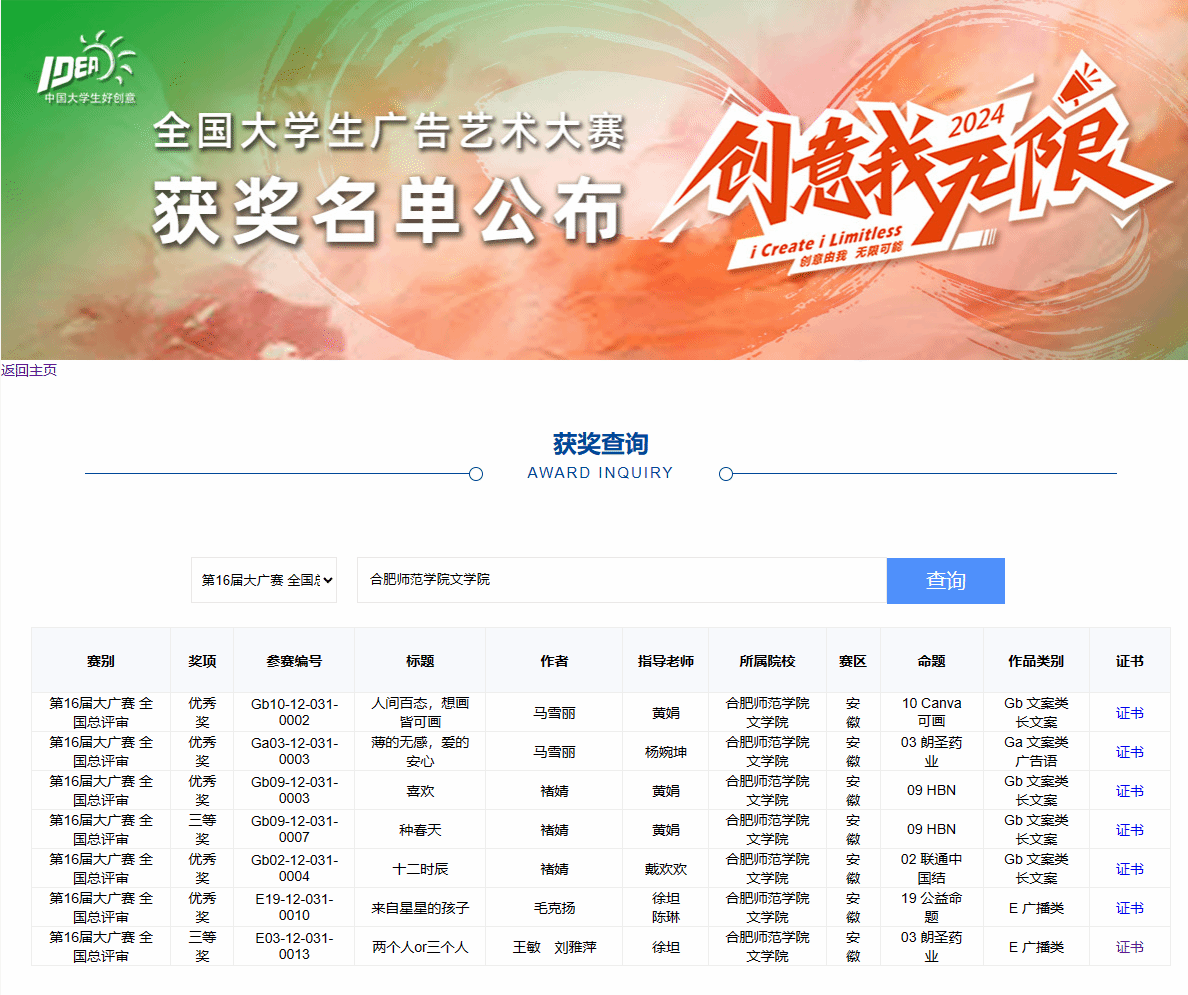 近日,第十六届全国大学生广告艺术大赛(简称“大广赛”)全国总评审结果正式公布。经过激烈角逐,beat365英国官方网站师生再创佳绩,共获得7项国家级奖项、35项省级奖项,其中国家级三等奖2项,国家级优秀奖5项,安徽赛区一等奖13项、二等奖10项、三等奖12项,beat365英国官方网站在全国赛区及安徽赛区获奖数量,创近年来参赛成绩新高。