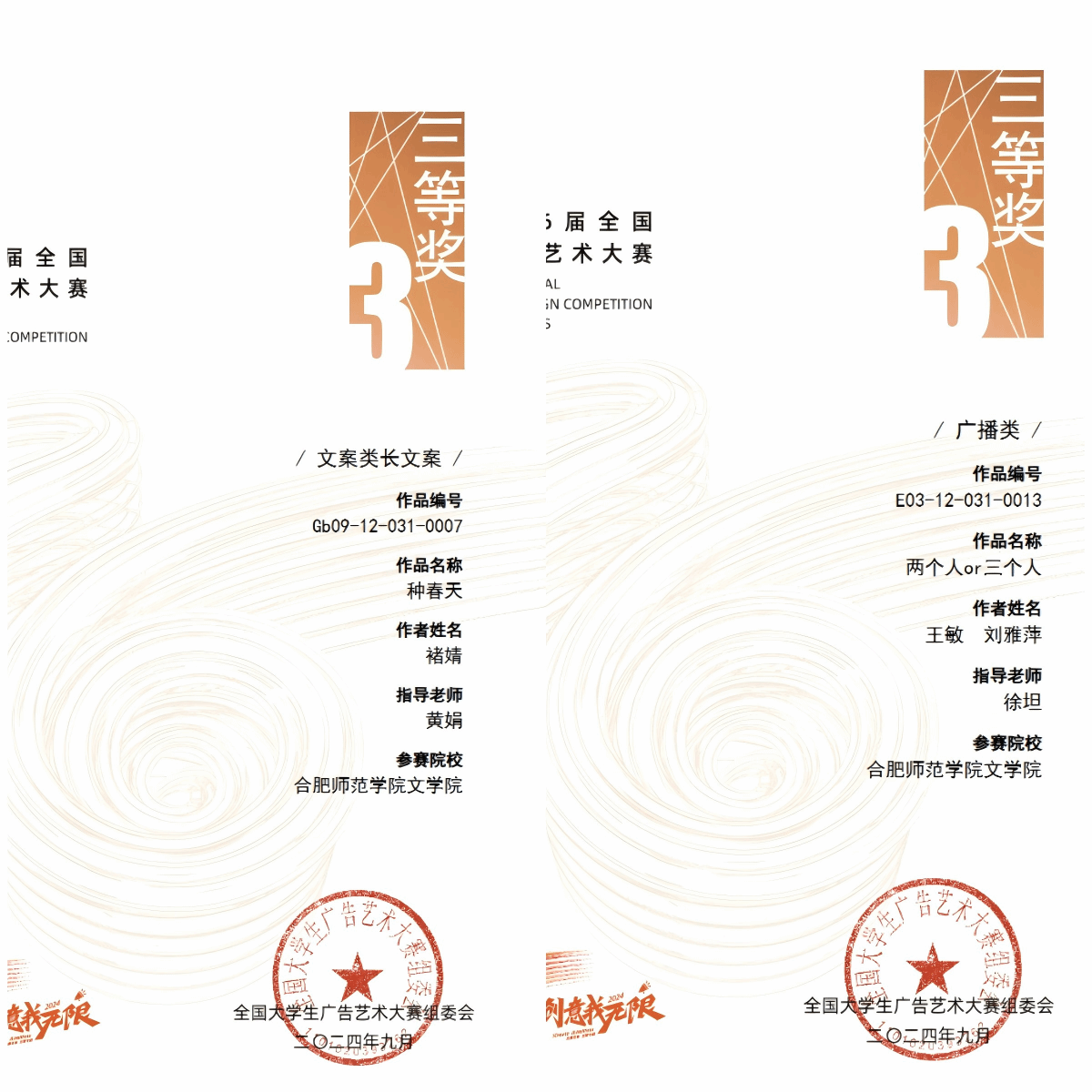 beat365英国官方网站历来重视对学生综合实践能力的培养,坚持“以赛促教、以赛促学、以赛促改”,注重早培养、早锻炼,学生从大一开始就在专业课老师指导下,参与学科竞赛活动,在今年的大广赛参赛学生中,有两位参赛时还是大一新生的同学,来自2023级网络与新媒体专业的王敏和毛克扬同学分别获得国家级三等奖1项,国家级优秀奖1项。
