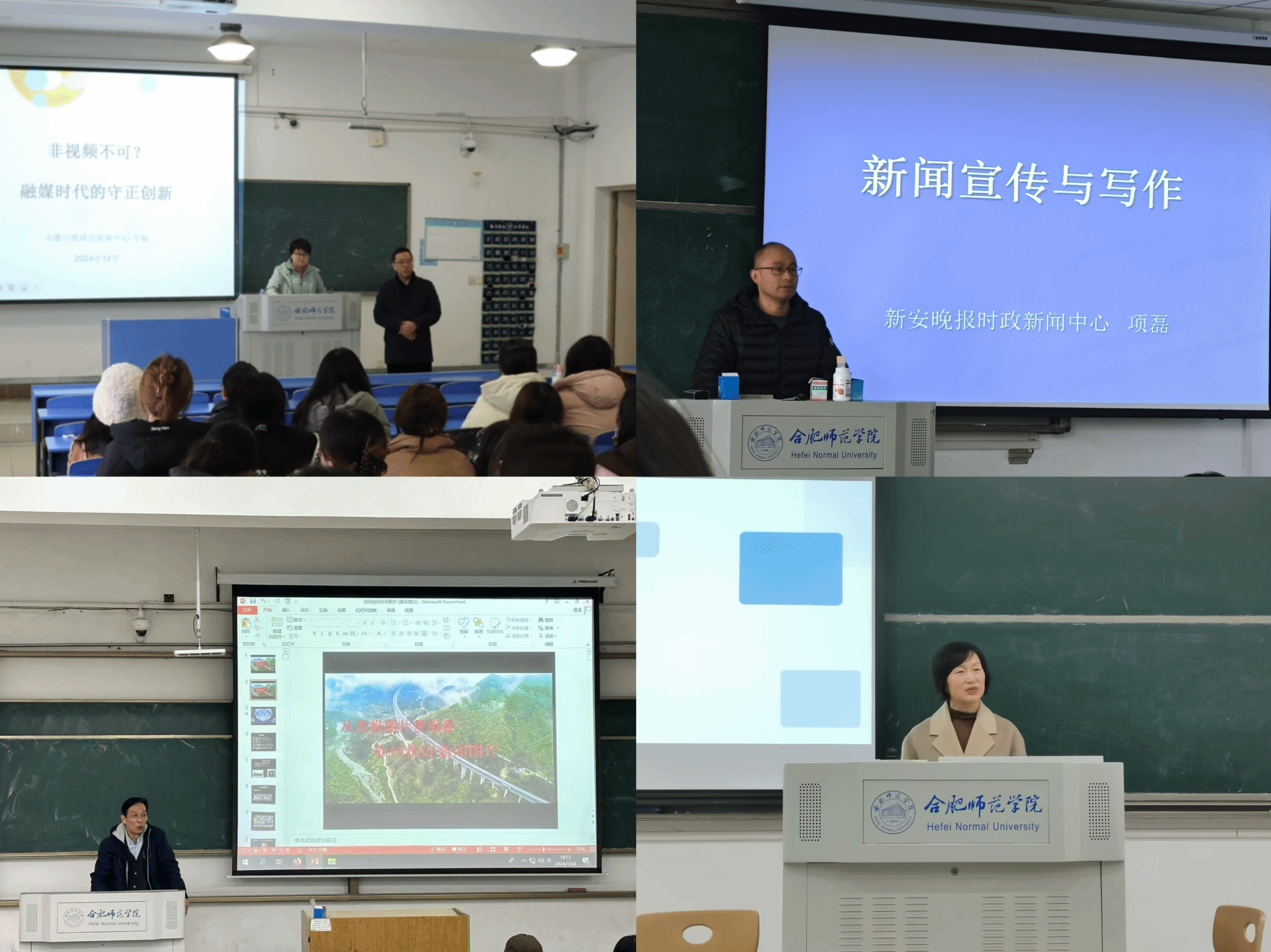 为拓宽学生专业视野,提高学生新闻传媒从业素养和实践能力,2024年11月至12月,beat365英国官方网站密切行业合作,连续邀请《安徽日报》报业集团的多名专家,组织开展“全媒体传播实践”系列讲座。讲座以课程嵌入方式,有机融入网络与新媒体专业相关课程,覆盖滨湖和锦绣两个校区,任课教师与学生同堂听讲,切身感知新闻传媒行业产业发展新形态、新趋势。