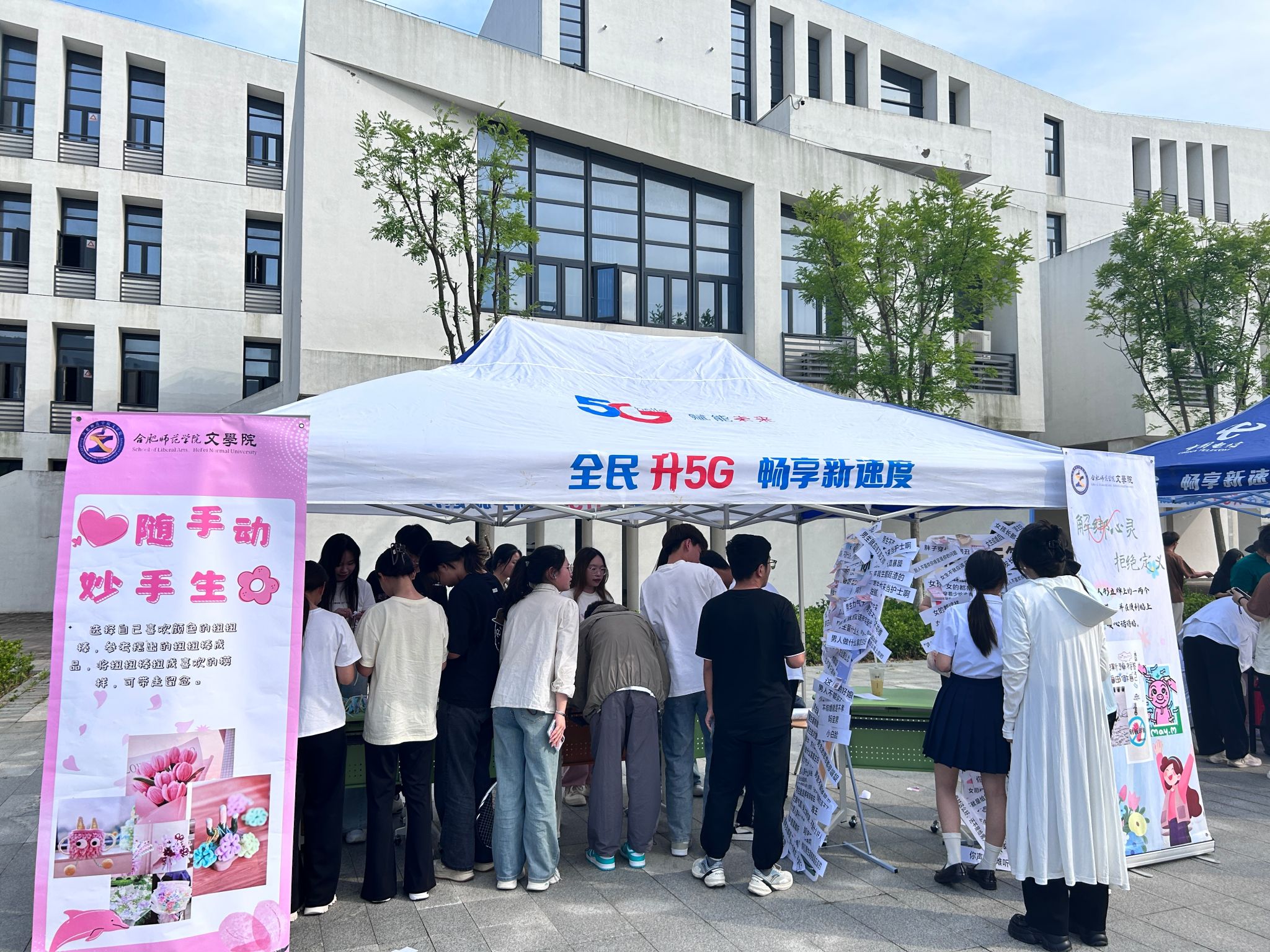 “解绑心灵、拒绝定义”展台可以让同学们在人形立牌上“撕掉”那些让人不舒服的标签,释放负面情绪,还可以在便利贴写上暖心话语贴在人形立牌上;“心随手动、妙手生花”展台邀请同学们用双手和智慧将一根根普普通通的扭扭棒变成栩栩如生的物品,锻炼了学生的动手、思维和协调合作的能力。