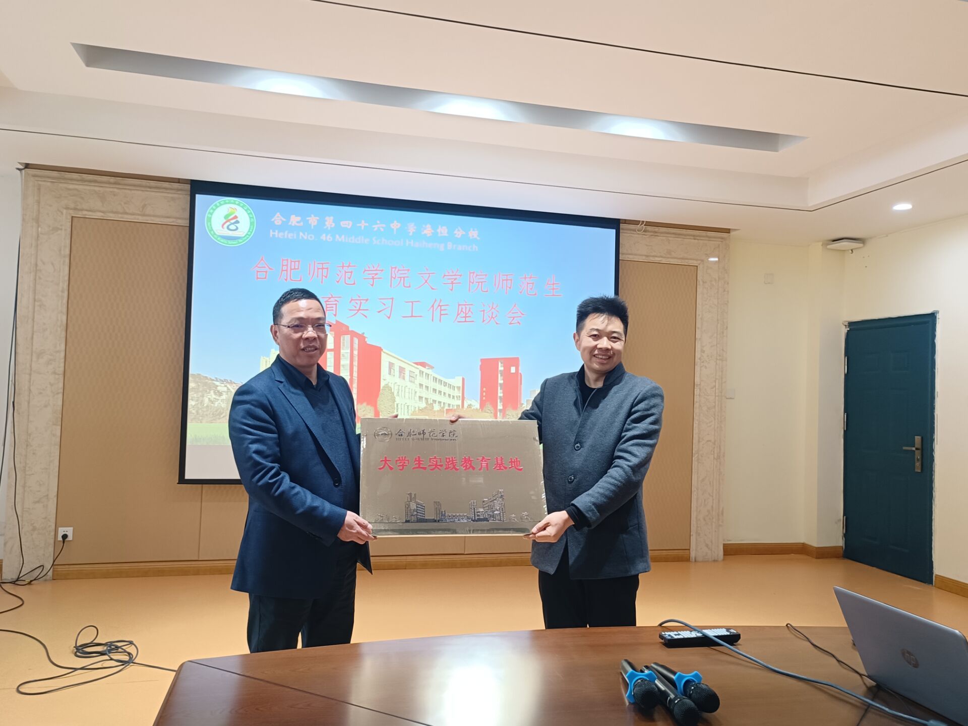 在合肥市四十六中学海恒分校召开实习生座谈会,该校副校长陈建林对beat365英国官方网站一行表示欢迎,并介绍了实习工作安排。beat365英国官方网站实习生分享了近期实习体会与收获,实习导师对师范生的实习情况作了交流,充分肯定了实习生踏实肯干的工作态度、良好的精神面貌和综合素质。双方就共建师范生实践教育基地进行签约并举行挂牌仪式。