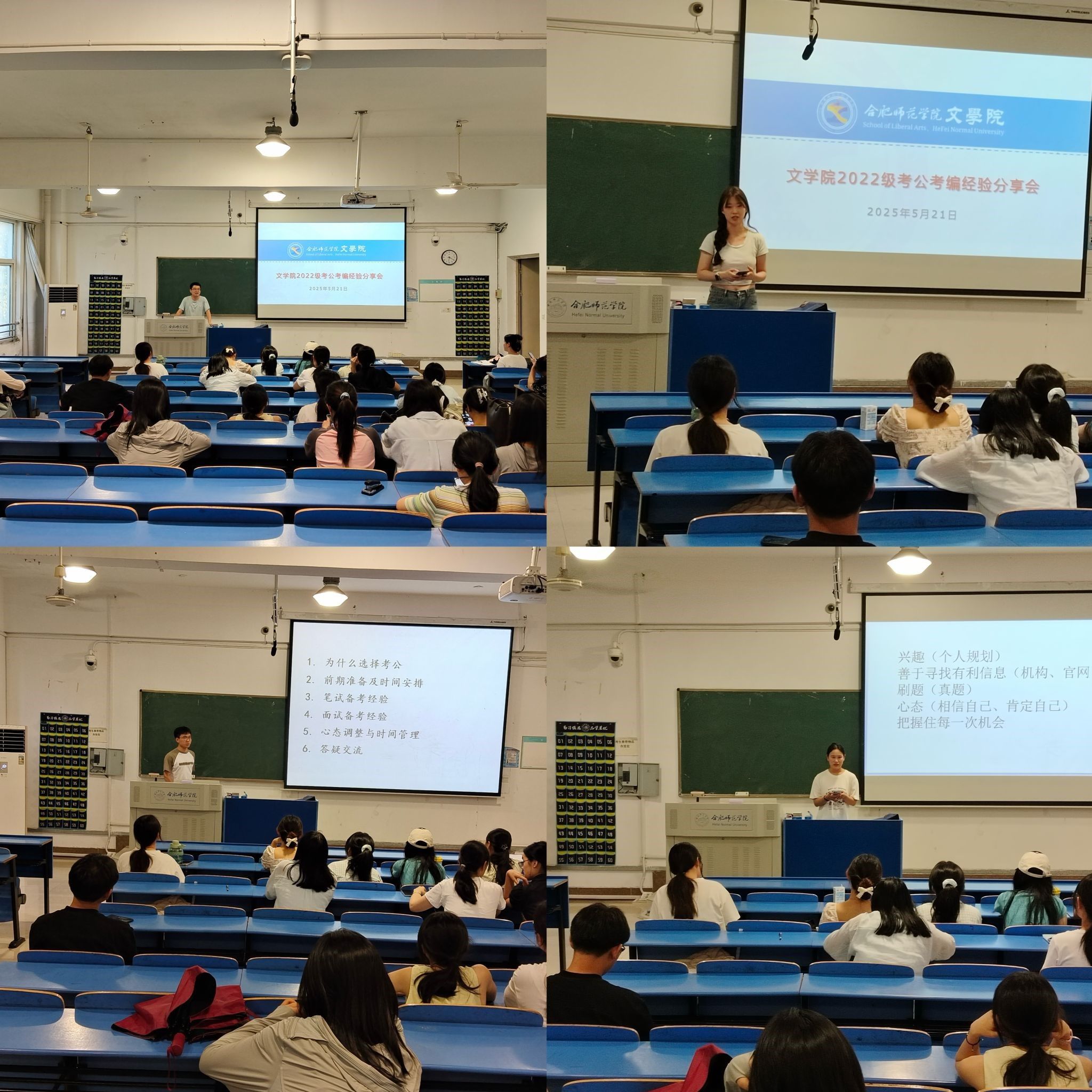 5月21日,beat365英国官方网站在逸夫楼A207教室举办考研升学经验分享和辅导交流会,进一步加强学生对考研的规划意识,助力同学们掌握科学备考方法、提升备考效能、增强考研信心。交流会面向2026届汉语言文学、汉语国际教育和网络与新媒体等三个专业考研意向学生,按照报考专业或方向类别邀请2024届考研至中国科学技术大学、南京林业大学、上海师范大学、安徽师范大学等重点大学的6位优秀学生分享交流考研经验。