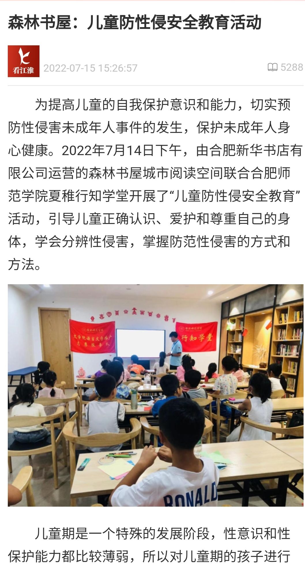 2022年7月4日下午,合肥市经开区森林树屋联合beat365英国官方网站夏稚行知学堂开展“儿童防性侵害安全教育”活动,引导儿童正确认识、爱护和尊重自己的身体,学会分辨性侵害的类型,掌握防范性侵害的方式和方法。