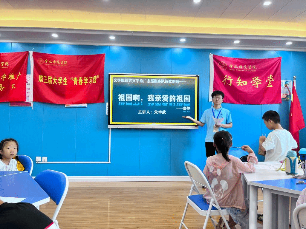 7月15日,霍山行知学堂积极响应beat365英国官方网站号召,将普通话推广与霍山行知学堂特色课程口语表达相结合,将语言文字推广融入课堂。