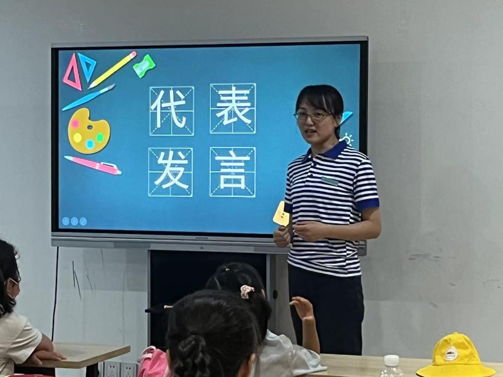 此次开班仪式是由夏稚行知学堂的领队小先生——陈睿主持的。首先,她向全体同学和家长介绍了我院行知学堂的办学理念、办学背景以及学堂的概貌。行知学堂自开办以来,一直深受广大学生的喜爱,在安徽多地以公益课堂为形式开展,引导青年学生实践出真知、实践长真才,也曾多次被《中国青年报》《人民日报》等报刊或网页刊登宣传。本次夏稚行知学堂以“思想教育”“兴趣培养”“科学普及”“情感教育”“心理辅导”“劳动教育”“公益实践”“安全防护”“课业辅导”为主要内容,开展了十五项课程,并安排专门的小先生进行教学教导。