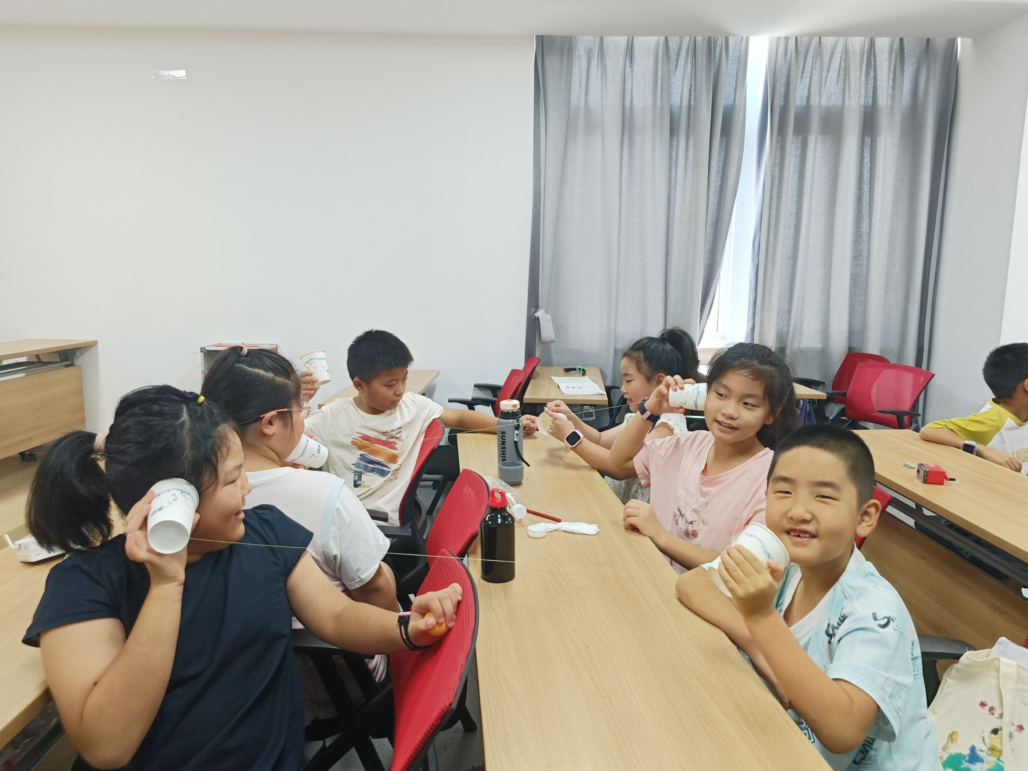 活动高潮是“土电话”自主实验环节。每两名学员一组,利用纸杯和棉线制作简易传声装置。“要拉直棉线才能听清楚!”孩子们在服务队指导下,发现声音通过棉线传播的规律。通过对比“拉直”与“松弛”状态下的传声效果,学员们总结出“固体能更好传播声音”的结论。
