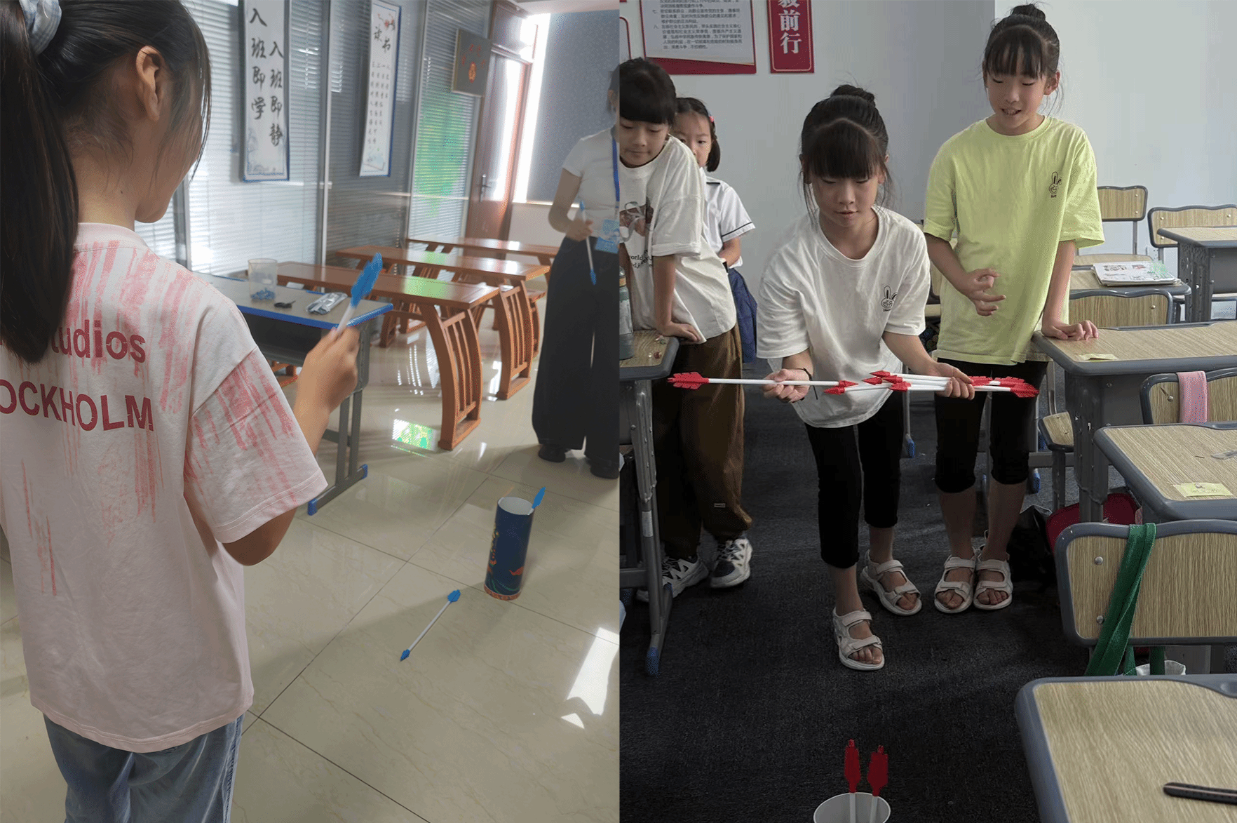介绍规则后,小学员们迫不及待地开始了实践活动,他们神态专注,手持箭矢,站在预设的位置,专注地将箭投入壶中。虽然一开始有些小朋友不太熟练,但在小先生们的耐心指导和鼓励下,他们也逐渐掌握了技巧,投中的次数也越来越多。现场的气氛十分活跃,课堂里弥漫着孩子们此起彼伏的欢笑声。
