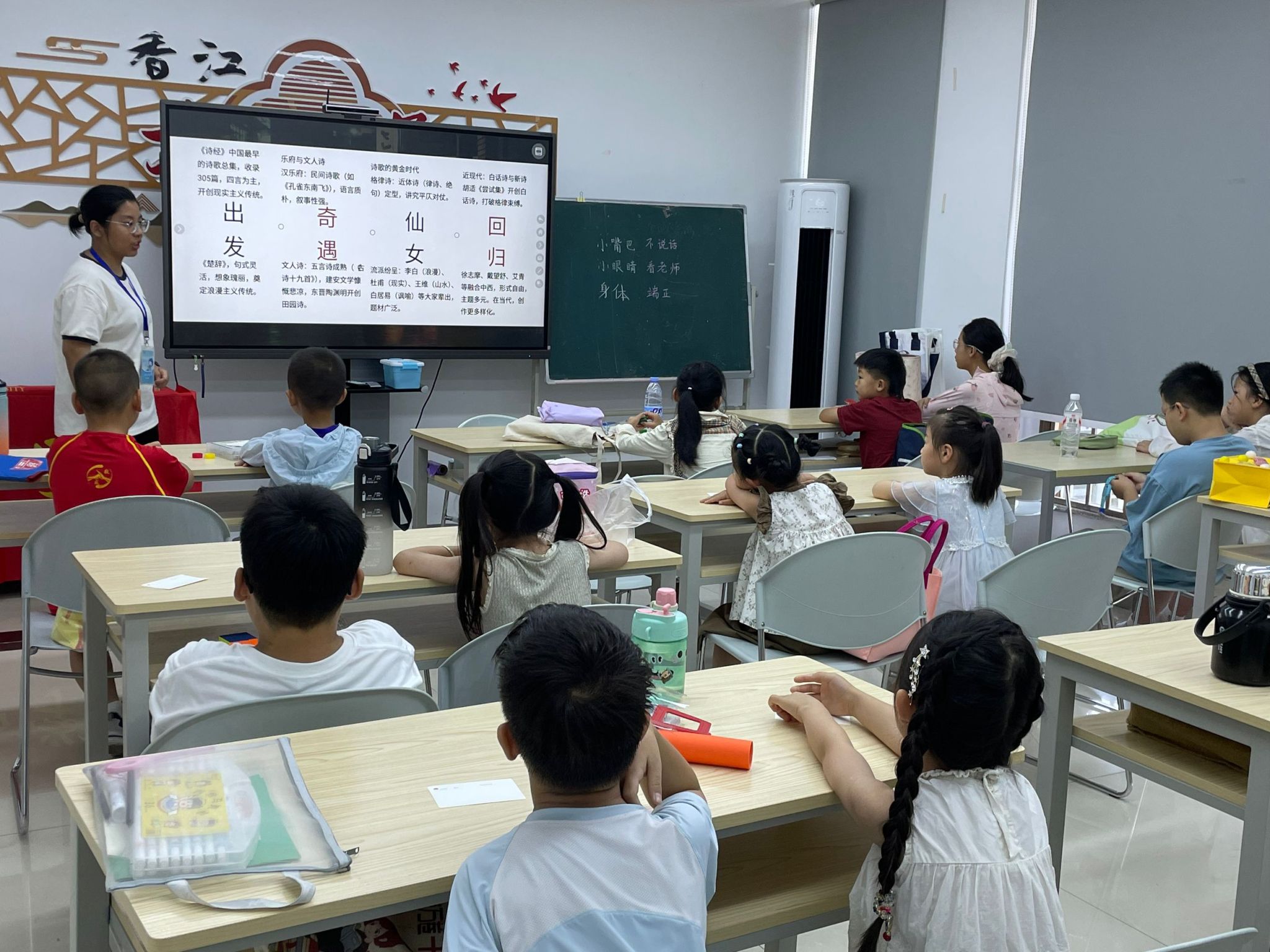 孔婧琦通过讲授诗歌几言,带领学员们走进诗歌的文化世界。从“关关雎鸠”出发奇遇乐府诗体,到唐诗宋词回归到课题自由诗,环环相扣激发了“小学员”们的学习热情。