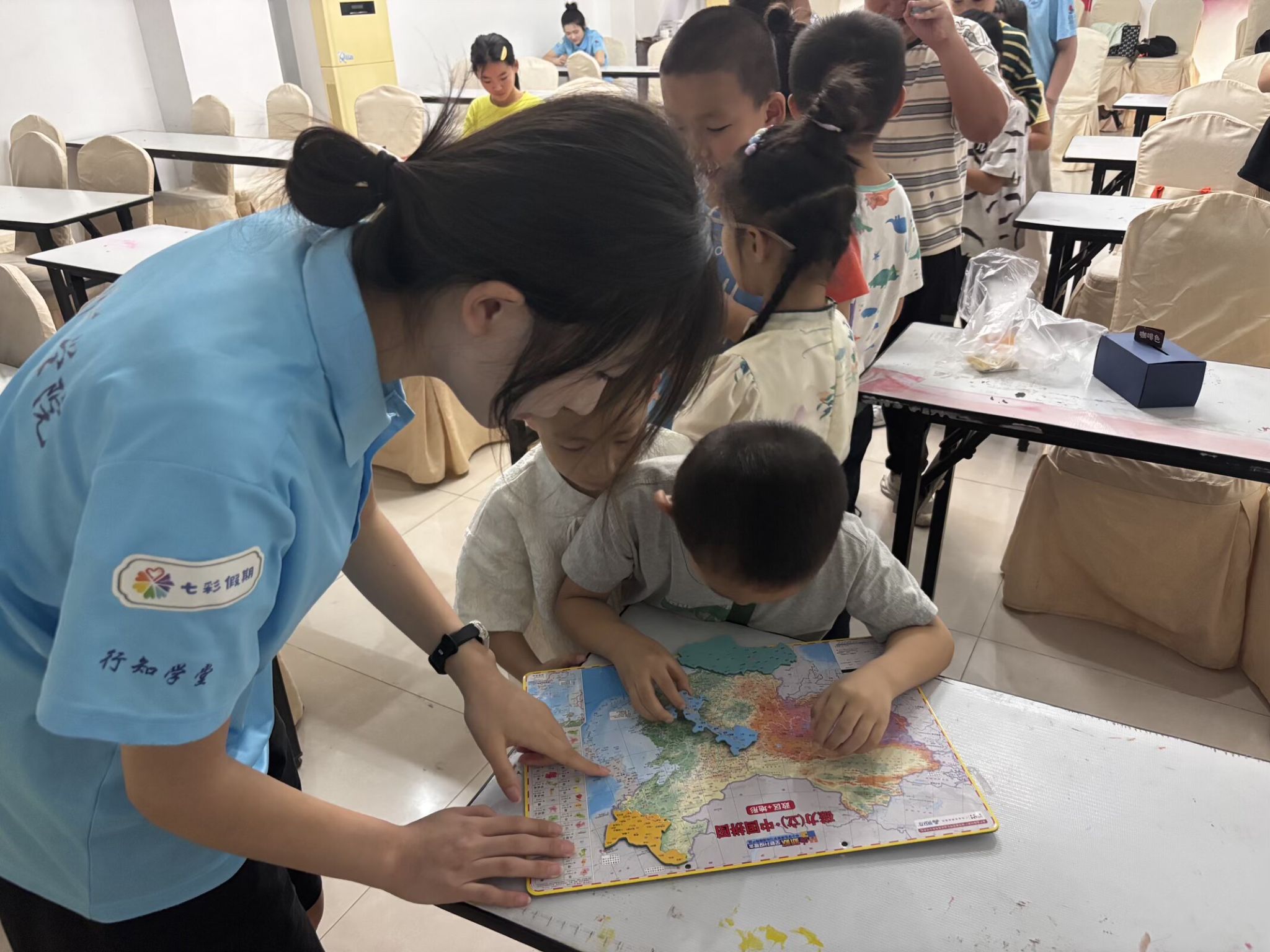 “寓教于乐”,是锦绣方兴社区翰林行知学堂“小先生”团队今年想要突出的宗旨,希望能够将趣味与知识巧妙融合,为孩子们打开探索世界的窗口。7月11日,学堂以“薪火传九州 同拼中国梦”为主题,通过生动的地图拼图教学,引导孩子们认识祖国版图,开展了一场意义深远的知识普及活动。