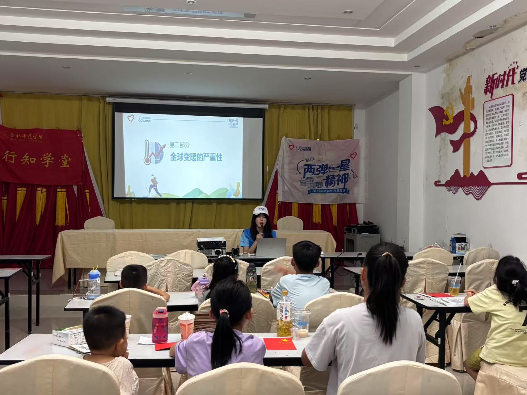 在介绍全球变暖的严重性时,王欣宇结合今年暑期的高温天气,让孩子们从自身经历出发感受环境问题的紧迫性。“大家是不是觉得今年夏天特别热?出门一会儿就满头大汗。”孩子们纷纷点头回应。她接着说道,很多地区因为高温发生了山火,冰川在不断融化,动物们的家园也受到了威胁。当王欣宇讲到“一旦到达气候临界点,生态环境的变化将不可逆转”时,教室里传来一声稚嫩而坚定的声音:“我们一定要好好保护环境呀!”这句童言稚语在课堂上回荡,深深触动了宣讲团成员的内心,让大家看到了孩子们对环境保护的真诚态度。