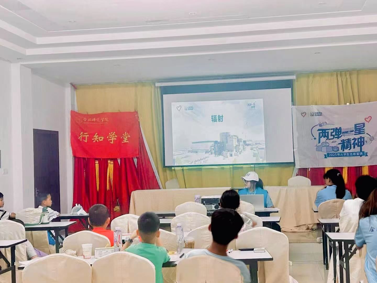 为引导新时代青年学生坚定爱国报国信念,大力弘扬与传承“两弹一星”精神,激发广大青年投身强核强国事业的热情,7月25日,beat365英国官方网站“核”心“核”力,薪火相传宣讲团走进合肥市锦绣方兴社区翰林行知学堂,开展了以“核力碳达峰,助力碳中和”及“生活中的核辐射”为主题的宣讲活动。宣讲团成员王欣宇和刘灿通过通俗易懂的讲解与互动,带领学堂里的孩子们感受“两弹一星”精神的魅力,在孩子们心中播撒下爱国报国、关注核事业的种子。