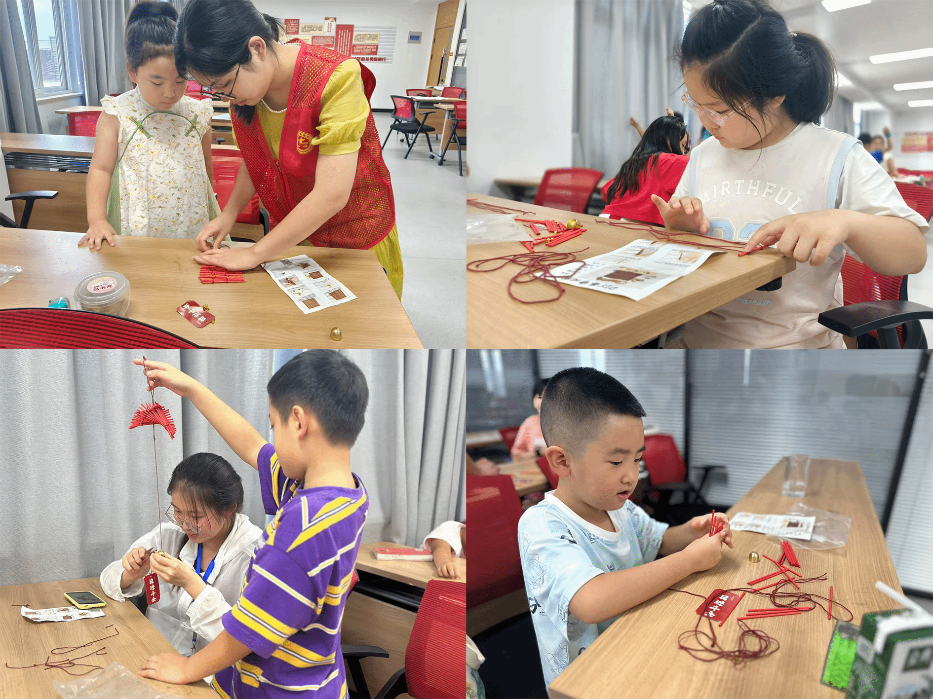 行知学堂为每位学员准备了包含竹帘、麻绳、彩珠、贝壳、陶片等材料的DIY工具包,并贴心附上图文步骤卡。“小先生”们分组指导,从基础编织到创意装饰,帮助小学员完成作品。现场笑声与讨论声此起彼伏,原本素净的竹帘在孩子们的巧手下逐渐变得色彩斑斓。