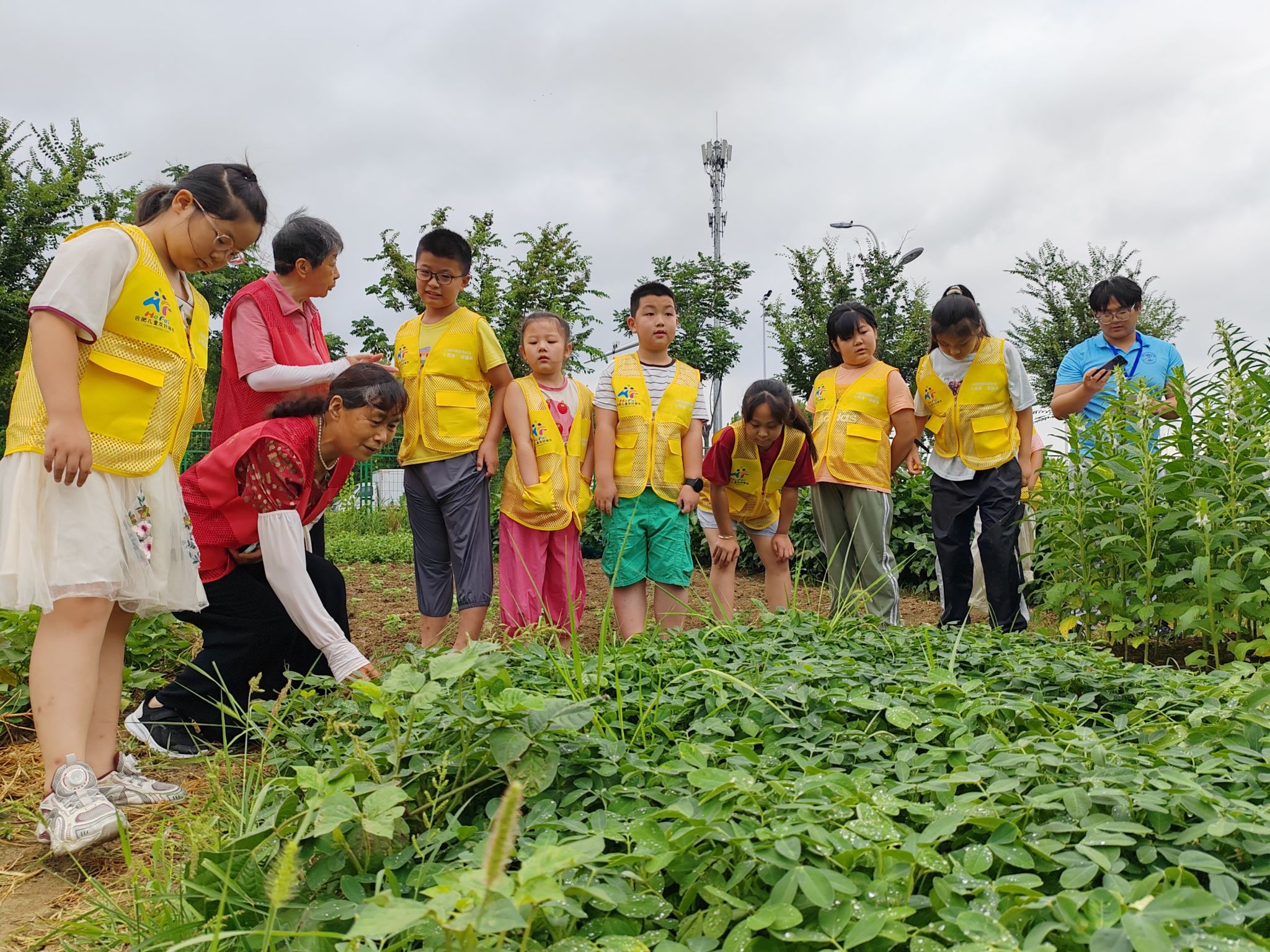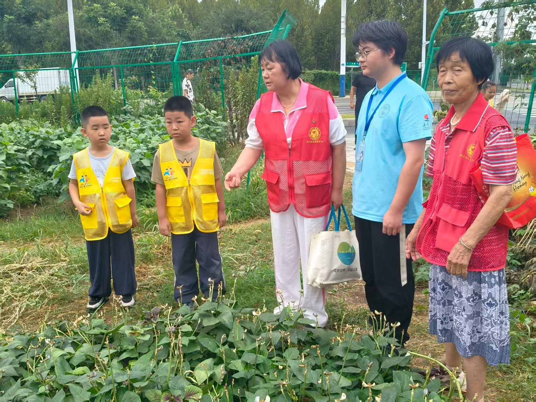 随后,孩子们身着醒目的黄色马甲,在社区工作人员、红大姐志愿服务队以及行知学堂“小先生”的带领下,整齐有序地来到了社区的劳动实践基地。这片绿意盎然的田地,瞬间成为了孩子们探索自然、学习农耕文化的天然课堂。